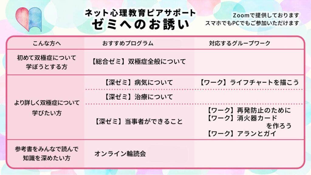 ネット心理教育ピアサポートのゼミでは、双極症を中心とした心理教育プログラムを、ピアサポート(当事者同士の支え合い)と専門職の協働によって行っています。