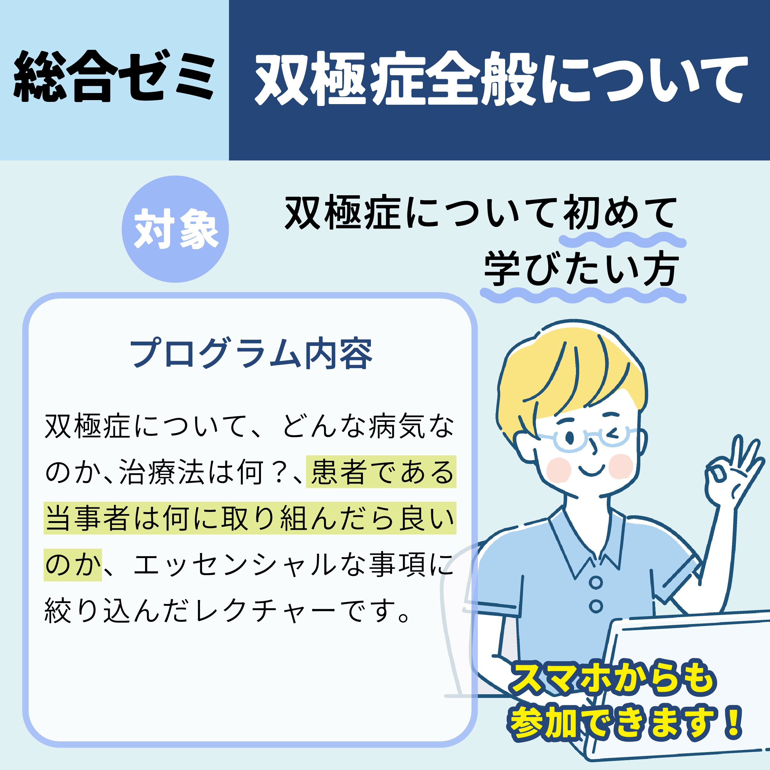 双極症の当事者の方、関係者の方、より深く学びたい方などのご参加お待ちしております。