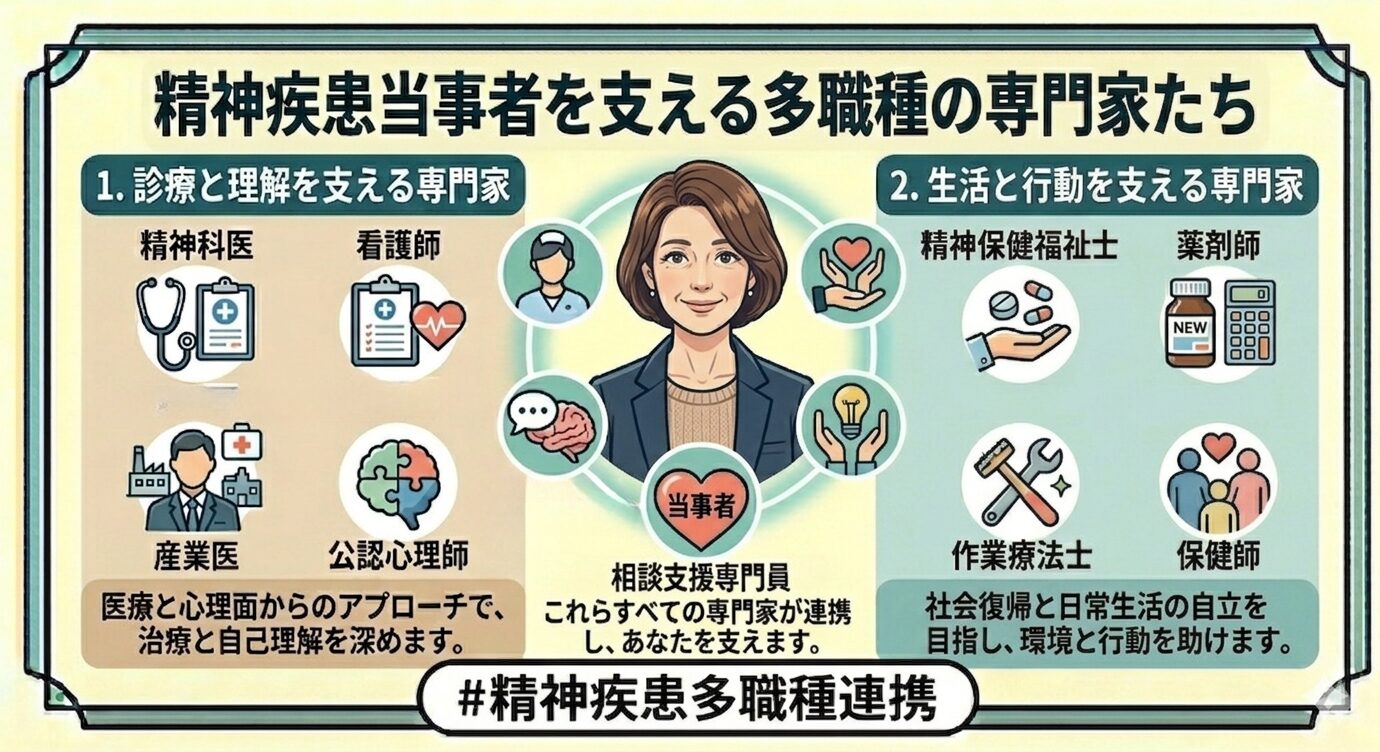 この記事では、精神疾患当事者を支える主な専門職を、医療・心理・福祉・地域生活支援に分けて整理します。あわせて、「どんな時に誰に相談するとよいか」も、実用的にまとめます。